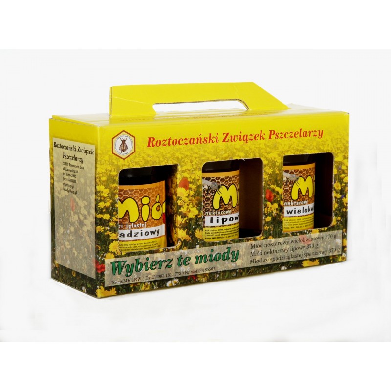 Zestaw trzech miodów wielokwiatowy 400 g, lipowy 370 g i spadziowy 370 g